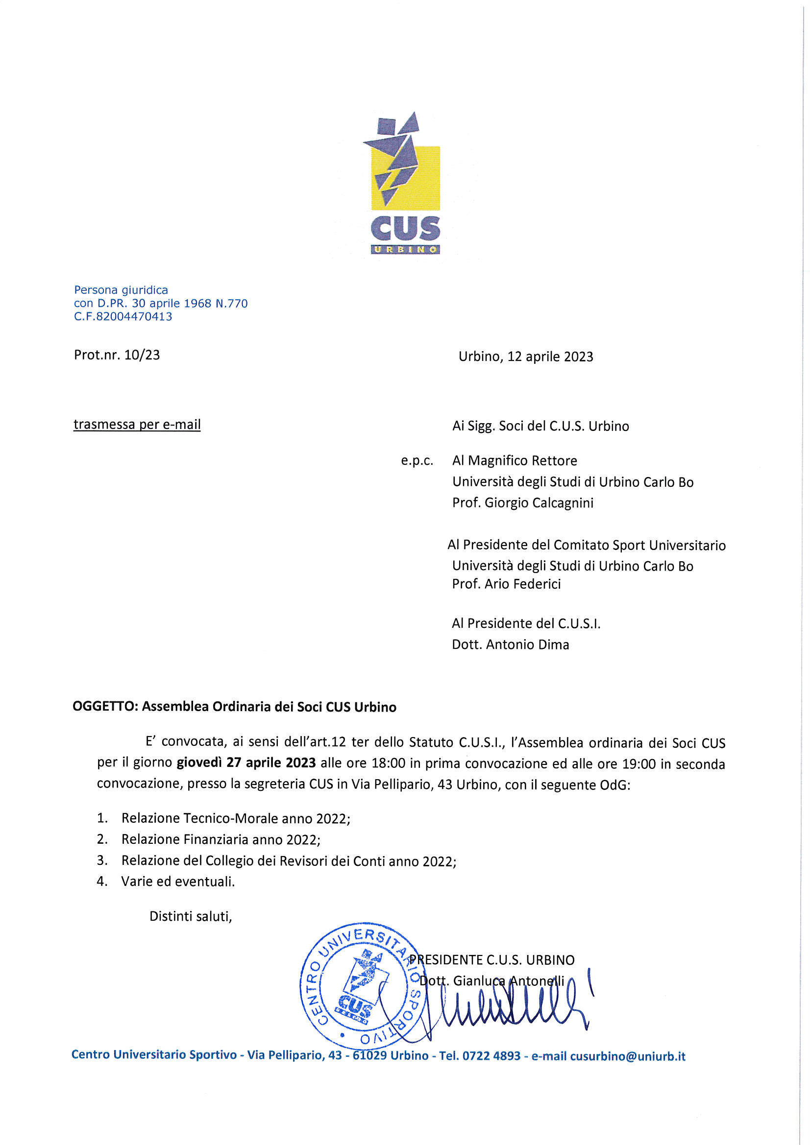 Assemblea Ordinaria dei SOCI CUS Urbino